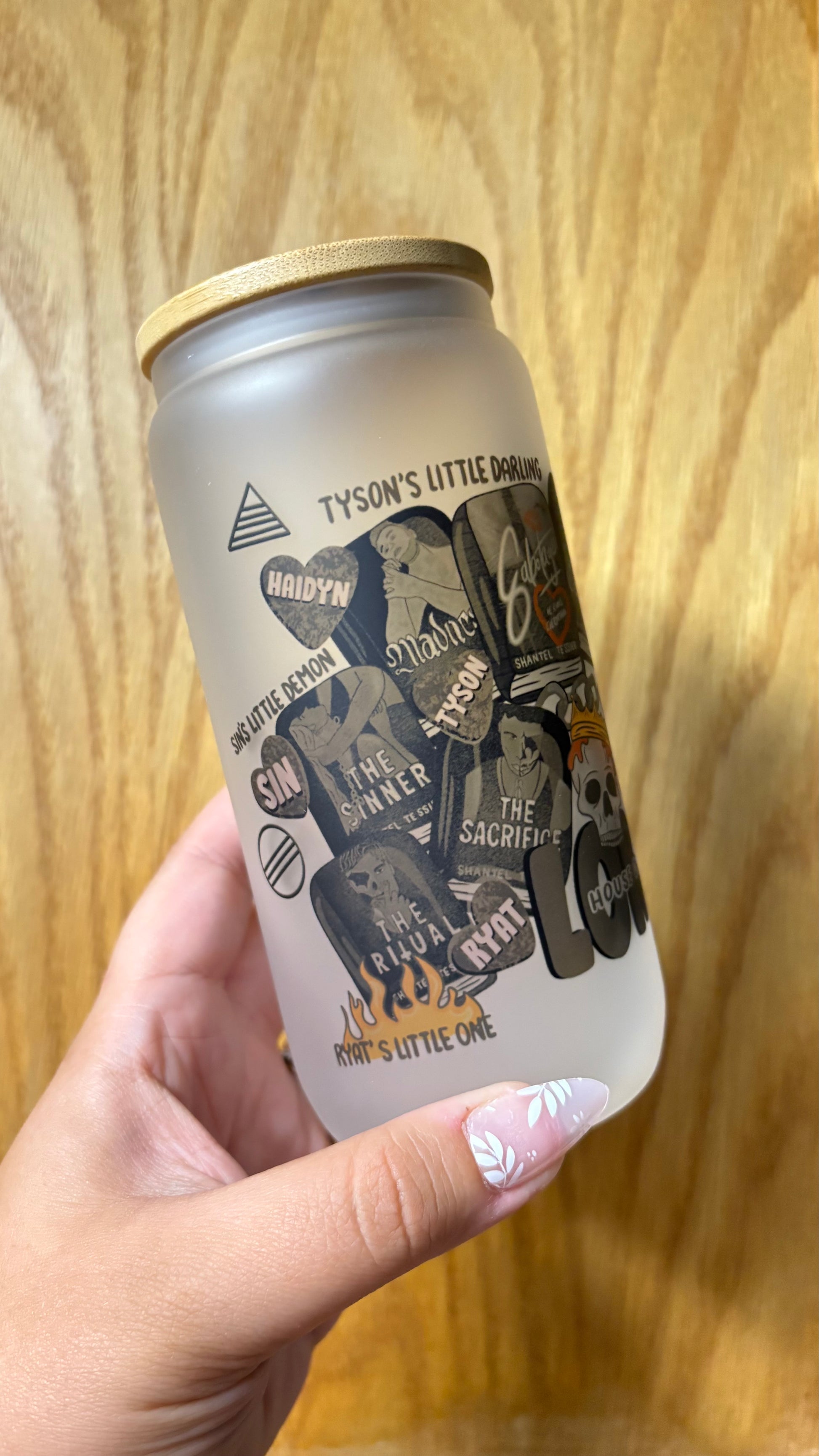 This 16oz glass cup comes with a lid and straw.